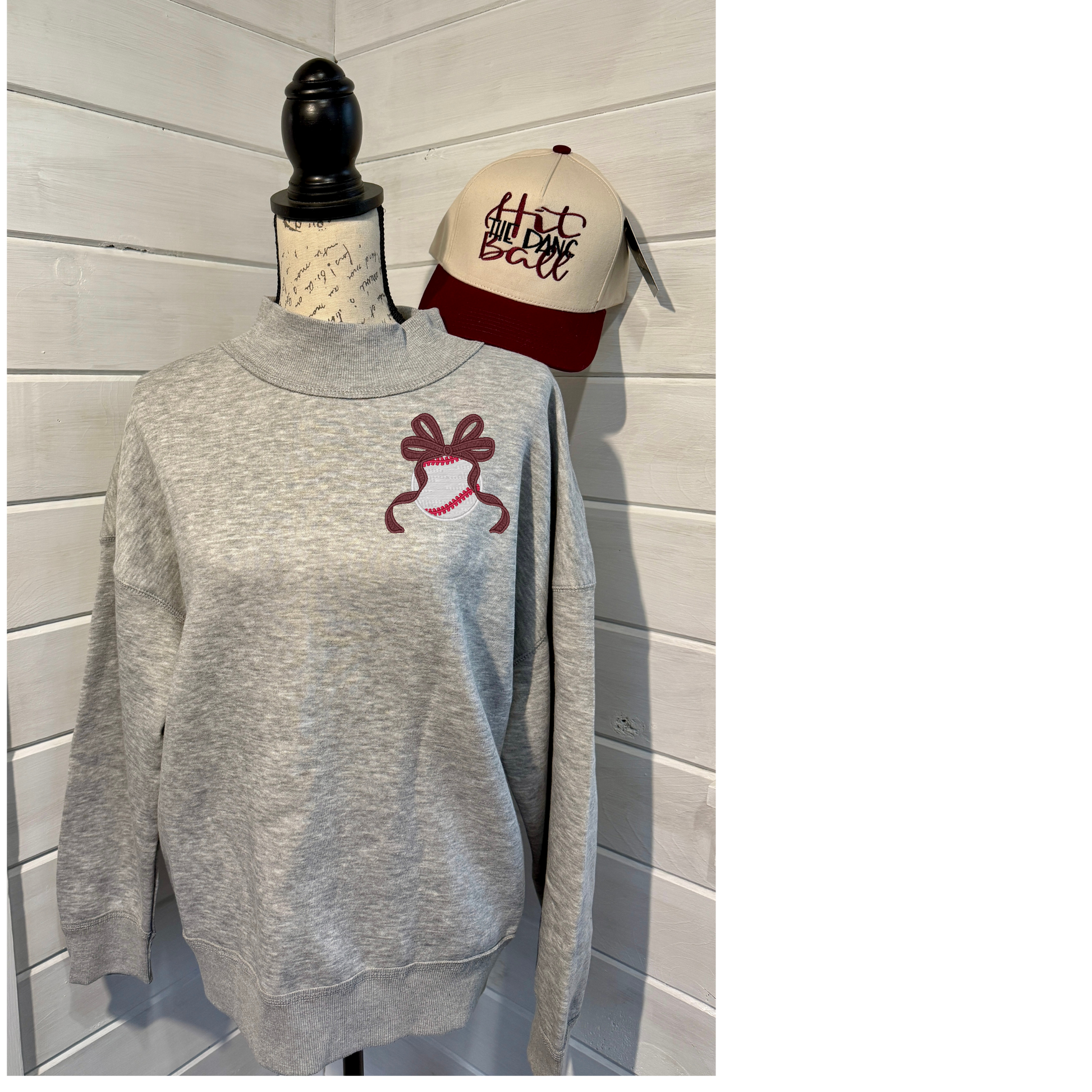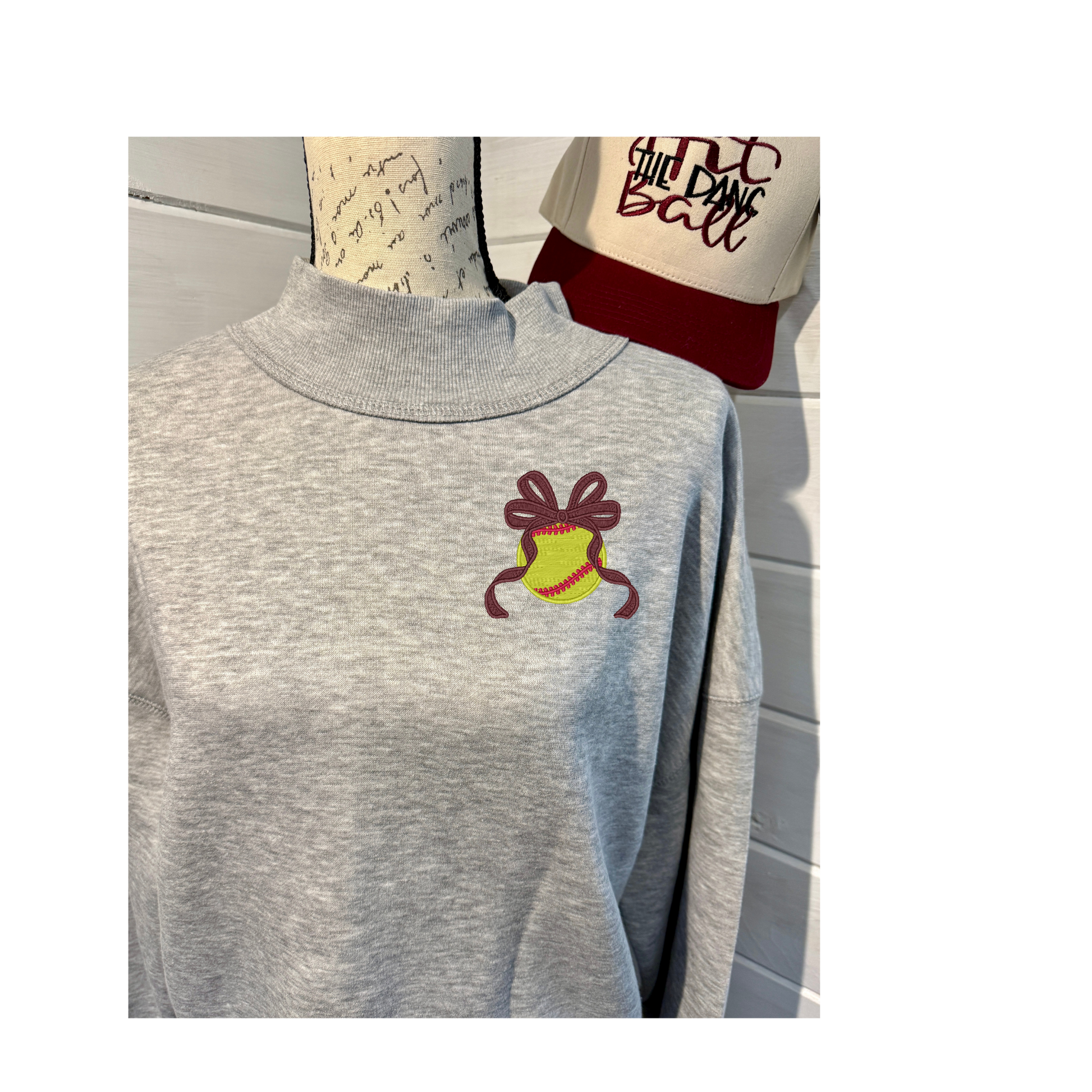 Show your team spirit in this heather gray mock neck sweatshirt, perfect for softball and baseball fans alike. Choose your bow color to match your school colors and make it uniquely yours. Crafted from a comfortable 60/40 cotton-poly blend, it offers durability and breathability for everyday wear. Available in sizes small through XL, this versatile piece layers beautifully and works for game days or casual outings.